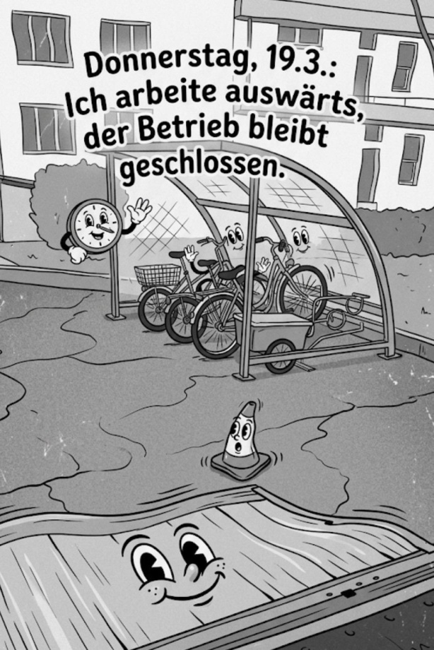 Donnerstag, 19.3.: Ich arbeite auswärts, der Betrieb bleibt geschlossen.